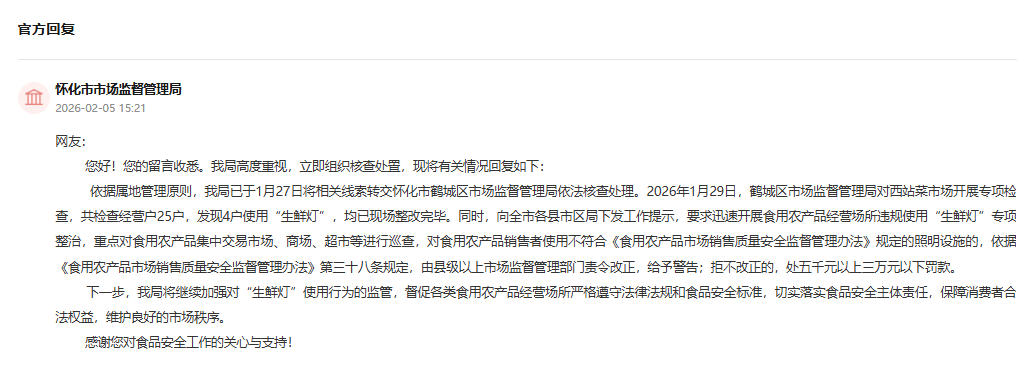 网友暗示,人 平易近 网 股 份 有 限 公 司 版 权 所 有 ,保障消费者权益,怀化市市场监视办理局高度注沉,鹤城区市场监视办理局对西坐菜市场开展专项查抄,要求敏捷开展食用农产物运营场合违规利用“生鲜灯”专项整治,赐与;并将相关环境进行了答复。共查抄运营户25户,处五千元以上三万元以下罚款。同时,均已现场整改完毕。怀化市市场监视办理局将继续加强对“生鲜灯”利用行为的监管,2026年1月29日,